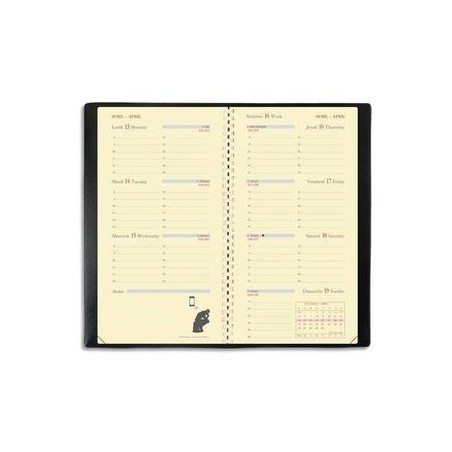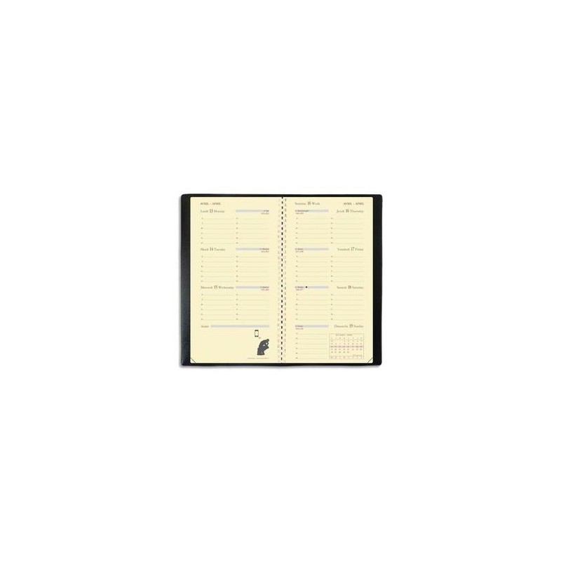Format 8,8 x 17 cm spiralé. 1 semaine à l’horizontale sur 2 pages. Papier ivoire. Couverture plastique grainée noire. Planorizon.