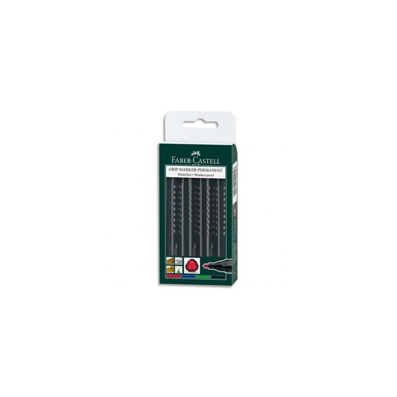 FABER CASTELL Pochette de 4 marqueurs permanents GRIP 1504, résiste à l'eau, pointe ogive, coloris assortis